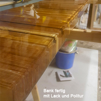 Wie sich bei der zweiten Bank herausstellte, ist es wesentlich leichter und weniger arbeitsaufwendig, bis Grit 320/400 zu schleifen und danach Klarlack aufzutragen. Die Schleifspuren sind absolut nicht mehr erkennbar und man spart Stunden und Schleifmittel.